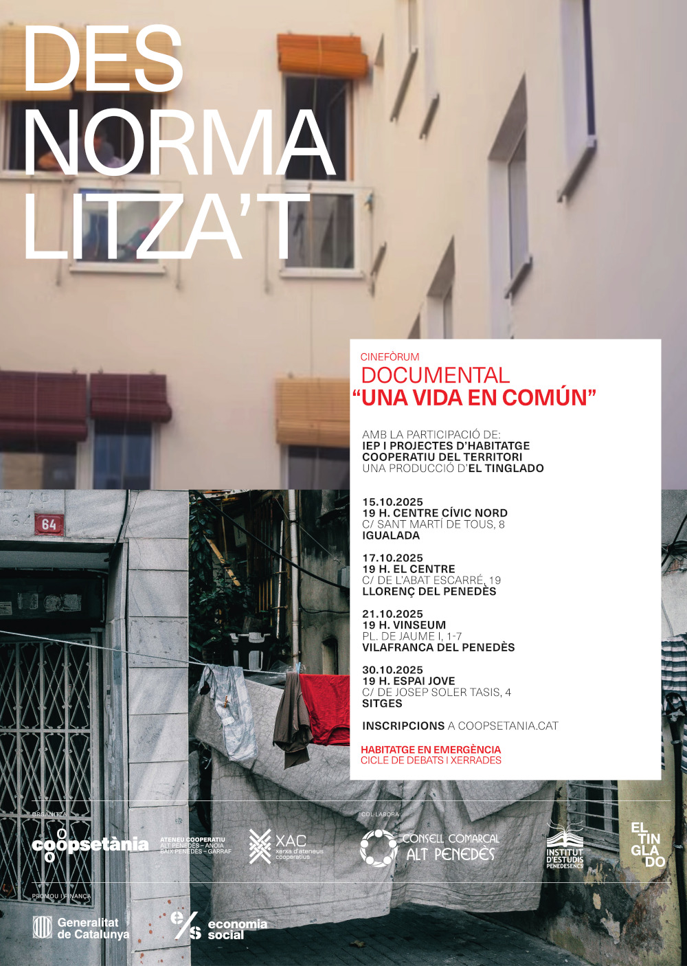Projecció del documental Una vida en común (El Tinglado), que recull el testimoni de set experiències d’habitatge cooperatiu en cessió d’ús. En acabar el passi hi haurà un col·loqui amb membres de les cooperatives d’habitatge La Torreta, d’Igualada, i Calafou, de Vallbona d’Anoia, els quals compartiran la seva experiència i els seus reptes principals.